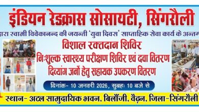 सिंगरौली- इंडियन रेड क्रॉस सोसायटी के तत्वाधान में आगामी 10 जनवरी को सिंगरौली जिले के अटल सामुदायिक भवन, बिलौंजी,…