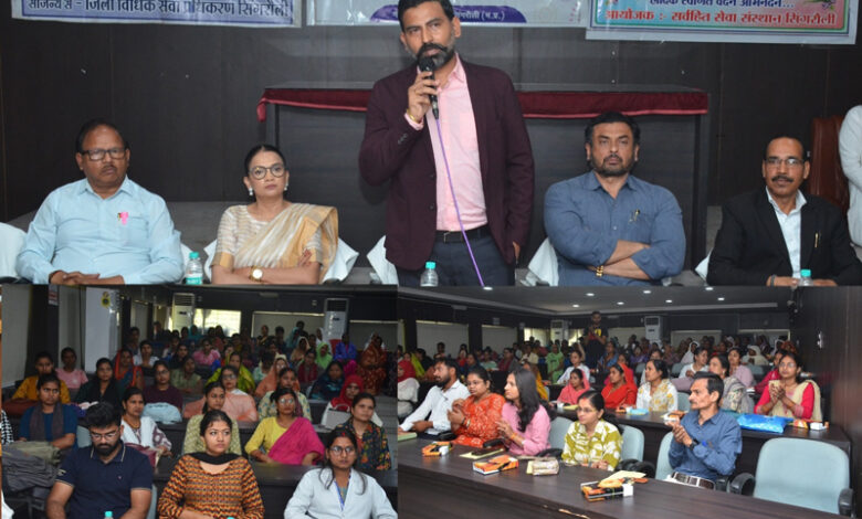 सिंगरौली ; अंतर्राष्ट्रीय महिला दिवस अंतर्गत साप्ताहिक गतिविधियों के तहत नगर पालिक निगम सिंगरौली के तत्वाधान,जिला विधिक सेवा प्राधिकरण एवं सर्वहित सेवा संस्थान के संयुक्त प्रायोजन में नगर निगम सिंगरौली के परिषद सभागार में विधिक साक्षरता एवं स्वच्छता जागरूकता हेतु संवाद कार्यशाला का आयोजन किया गया जिसमें शहरी क्षेत्र के स्व-सहायता समूह,सामाजिक कार्यकर्ता,स्कूली छात्राएं,निगम के सफाईमित्र और अधिकारी कर्मचारियों की प्रमुख सहभागिता रही।