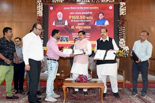 भोपाल : मुख्यमंत्री डॉ. मोहन यादव ने कहा है कि मध्यप्रदेश, देश के सर्वाधिक सशक्त, आर्थिक रूप से सुदृढ़ और बेहतर वित्तीय प्रबंधन वाले प्रथम तीन राज्यों में से एक है। राज्य सरकार प्रदेश के उद्यमियों को प्रोत्साहित करने के लिए हरसंभव सहयोग और मार्गदर्शन उपलब्ध करा रही है। देश-दुनिया के सभी निवेशकों के लिए प्रदेश के दरवाजे खुले हैं। हम उद्योग मित्र नीतियों और सहयोग की भावना के साथ उनके स्वागत के लिए तत्पर हैं। प्रधानमंत्री श्री नरेन्द्र मोदी के नेतृत्व में मध्यप्रदेश भारतीय अर्थव्यवस्था में उद्योग हो या कृषि हर क्षेत्र में योगदान के लिए निरंतर सक्रिय है। एमएसएमई इकाइयां औद्योगिक गतिविधियों का प्रभावी केन्द्र होने के साथ लाखों परिवारों के स्वावलंबन का आधार भी है। मुख्यमंत्री डॉ. यादव सोमवार को समर्थ एमएसएमई विकसित मध्यप्रदेश की थीम पर मुख्यमंत्री निवास में 257 से अधिक एमएसएमई इकाइयों को उनके खाते में 169.57 करोड़ से अधिक की प्रोत्साहन राशि सिंगल क्लिक से जारी कर संबोधित कर रहे थे।