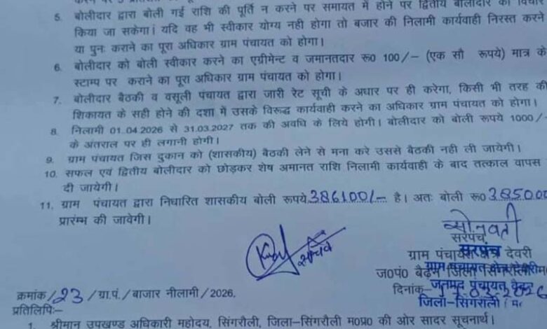 सरपंच द्वारा मुख्य कार्यपालन अधिकारी को भेजे गए पत्र में आरोप लगाया गया है कि पंचायत सचिव ने नियमों को दरकिनार करते हुए मनमाने तरीके से बोली प्रक्रिया पूरी कराई। बताया गया कि 24 मार्च 2026 को इश्तेहार जारी हुआ, लेकिन 30 मार्च को केवल तीन चुनिंदा लोगों से अमानत राशि जमा कराकर जल्दबाजी में बोली कर दी गई, जबकि अन्य इच्छुक लोगों को समय समाप्त होने का हवाला देकर बाहर कर दिया गया।