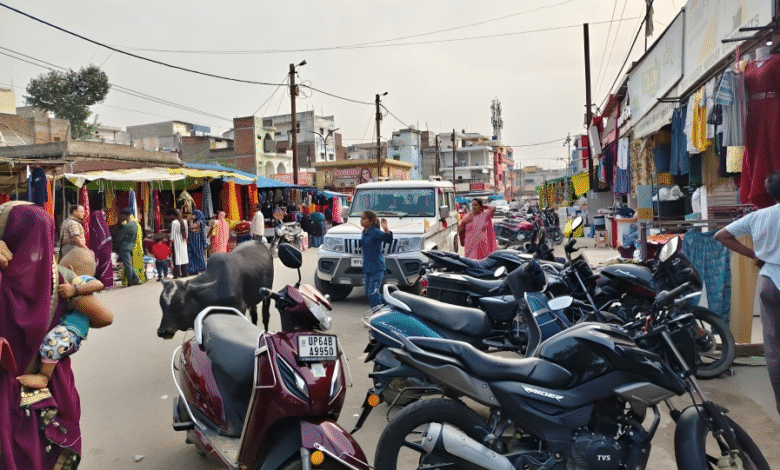 दुकानों का विस्तार करने एवं बाईको को सड़क पर खड़ा करने से लगता है रोजाना जाम