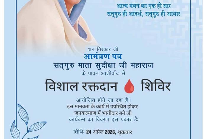 सिंगरौली;संत निरंकारी मिशन के तत्वावधान में जिले में एक विशाल रक्तदान शिविर का आयोजन किया जा रहा है। यह शिविर 24 अप्रैल 2026, शुक्रवार को आयोजित होगा, जिसमें अधिक से अधिक लोगों से भाग लेकर मानवता की सेवा में योगदान देने की अपील की गई है।