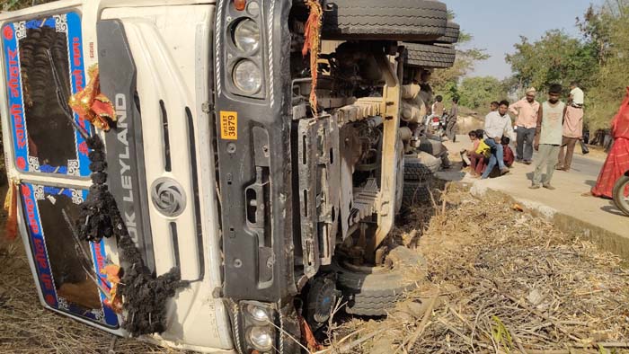 मॉडल विद्यालय के पास पलटा रेत से भरा हाईवा, बाल-बाल बचीं 9 जिंदगियां