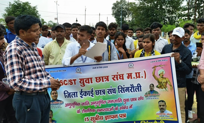 जिला मुख्यालय बैढ़न में आज दिन मंगलवार को छात्रवृत्ति की मांग सहित 15 सूत्रीय विभिन्न समस्याओं को लेकर के एससी-एसटी और पिछड़ा वर्ग के छात्रों ने सिंगरौली में कलेक्ट्रोरेट के सामने प्रदर्शन किया और 15 मांगों का ज्ञापन एसडीएम को सौंपा।