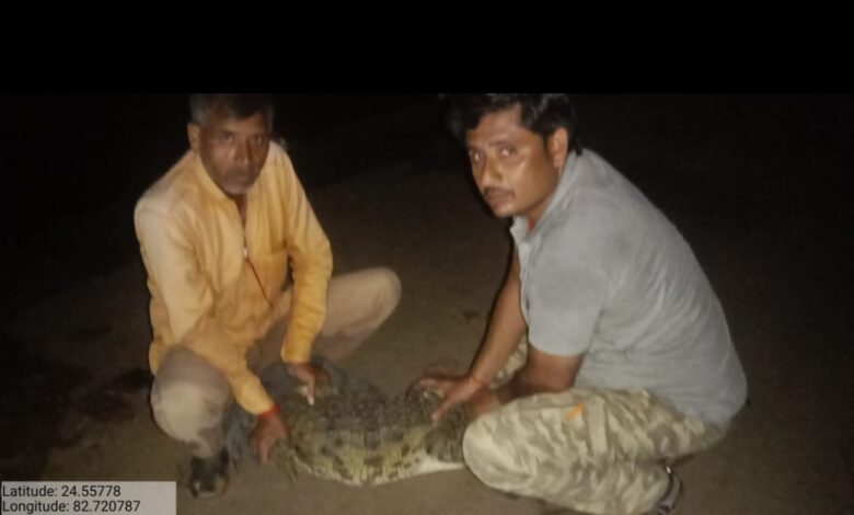 रेस्क्यू करके मगरमच्छ को पकड़ कर सोन नदी में सुरक्षित छोड़ा गया।