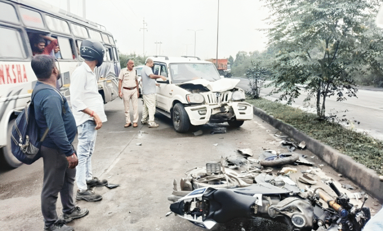 बाईक व स्कॉर्पियों की हुई जोरदार भिड़ंत जिसमे तीन लोग बुरी तरह घायल पाए गए
