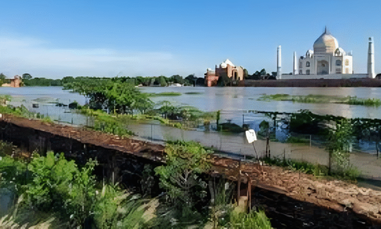 यमुना के बढ़ते जलस्तर ने ताजमहल तक को अपनी जद में ले लिया है। यमुना का पानी स्मारक की पिछली दीवार से टकरा रहा है और मेहताब बाग में करीब दो फीट पानी भर चुका है। हालांकि, ताजमहल की सुरक्षा संरचना पर कोई खतरा नहीं बताया जा रहा है, फिर भी विशेषज्ञ और प्रशासन पूरी तरह सतर्क हैं। वहीं दशहरा घाट पूरी तरह डूब चुका है।