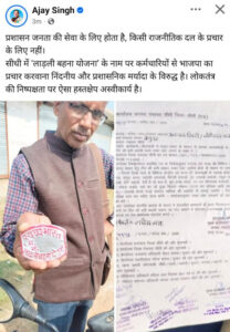 सीधी में ‘लाड़ली बहना योजना’ के नाम पर कर्मचारियों से भाजपा का प्रचार करवाना निंदनीय और प्रशासनिक मर्यादा के विरुद्ध है।लोकतंत्र की निष्पक्षता पर ऐसा हस्तक्षेप अस्वीकार्य है।