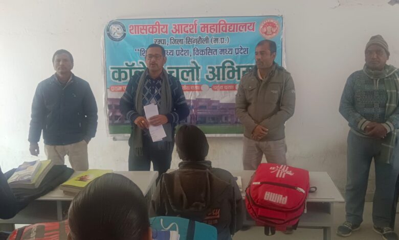 सिंगरौली -मध्यप्रदेश शासन उच्च शिक्षा विभाग द्वारा शैक्षणिक सत्र 2026-27 में विद्यार्थियों को महाविद्यालयीन शिक्षा से जोड़ने के उद्देश्य से 5 दिसंबर से 5 जनवरी तक “कॉलेज चलो अभियान” संचालित किया जा रहा है। इसी क्रम में शासकीय आदर्श महाविद्यालय रम्पा सिंगरौली द्वारा एक अभिनव पहल करते हुए विद्यालय स्तर पर विद्यार्थियों को उच्च शिक्षा एवं नई शिक्षा नीति 2020 से संबंधित जानकारी प्रदान की गई ।